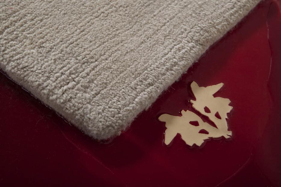 The neutral textile surface contrasts with an irregular red layer beneath, evoking what is traditionally concealed, removed, or symbolically “swept under the rug.” Books, objects, and fragments of everyday life leave subtle impressions, transforming memory into relief rather than narrative.