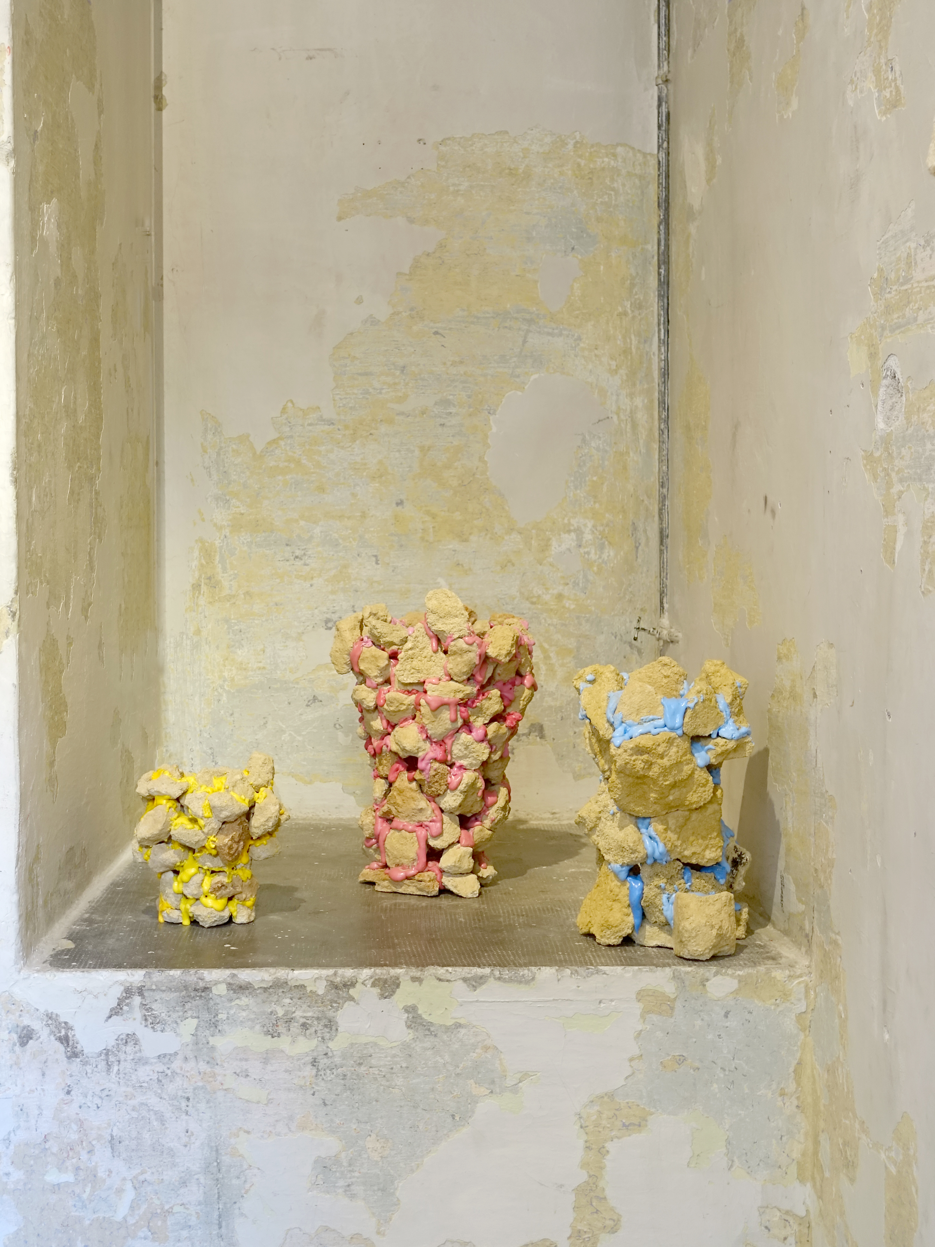The works take the archetype of the vase — a functional, domestic object — and displace it into an unstable territory between sculpture and utility.
